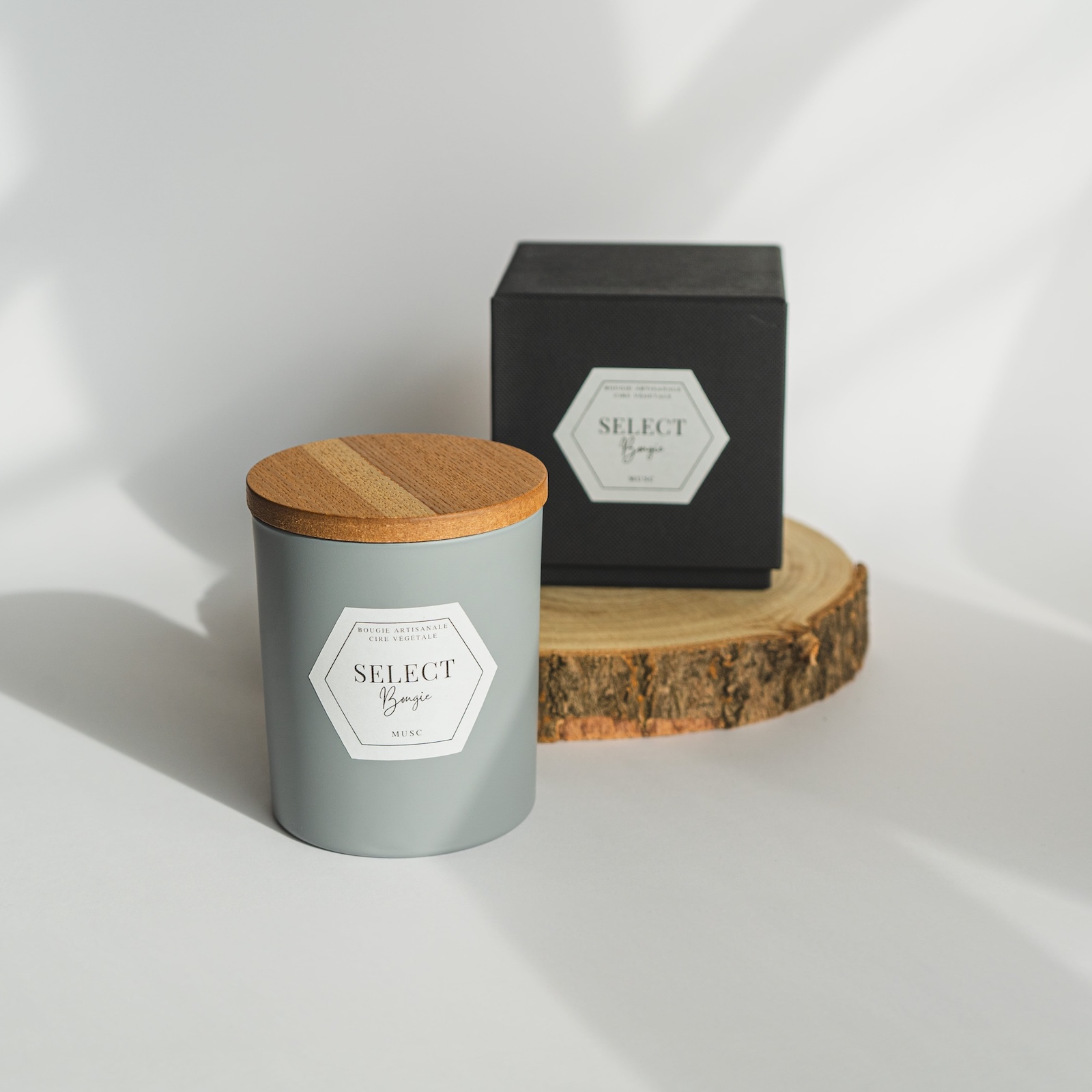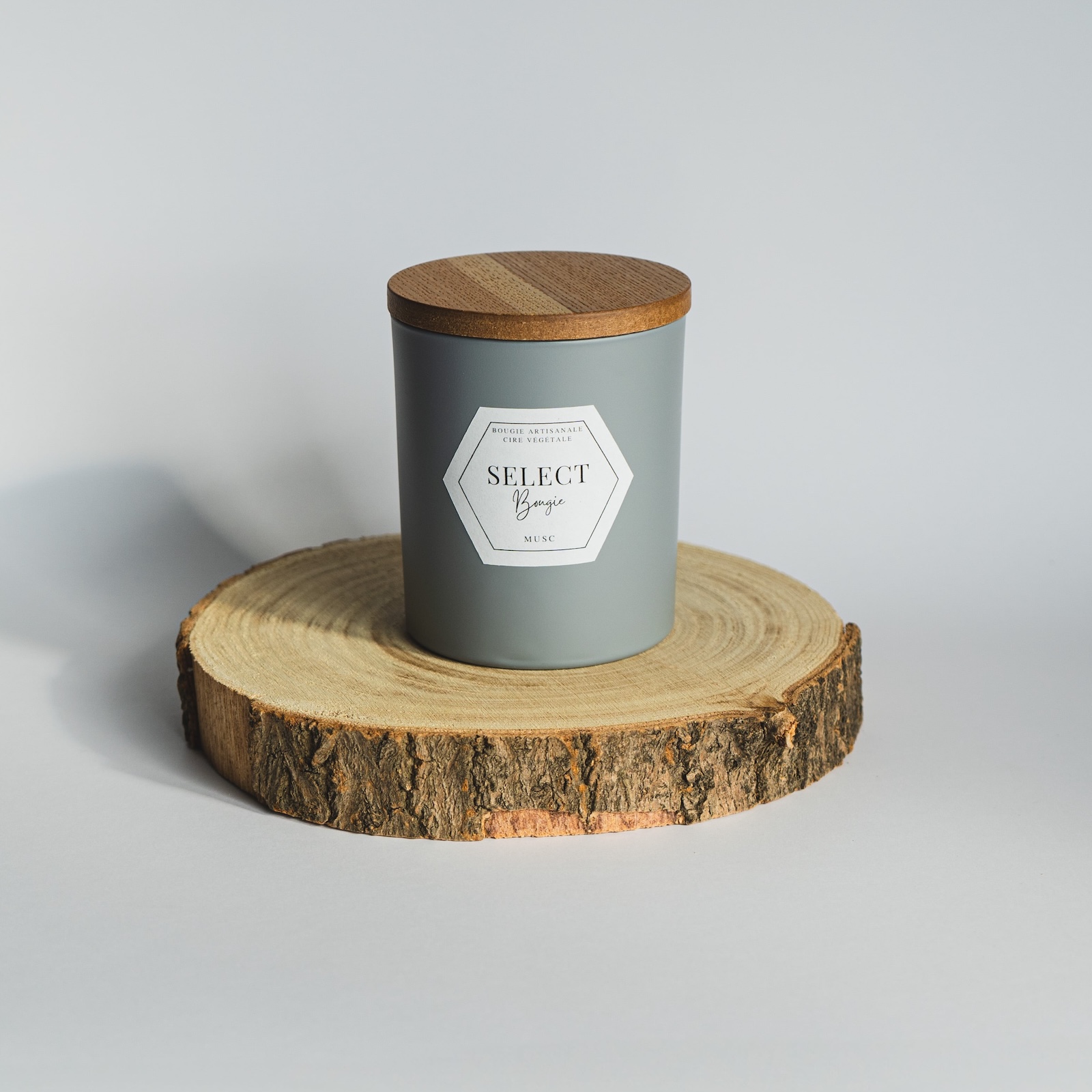 Bougie composée de cire végétale (colza et coco), de parfum de Grasse, d'une mèche en coton, d'un couvercle en bois et d'un contenant en verre gris mat.