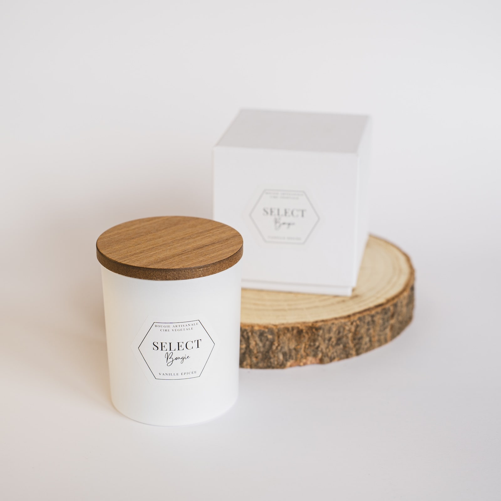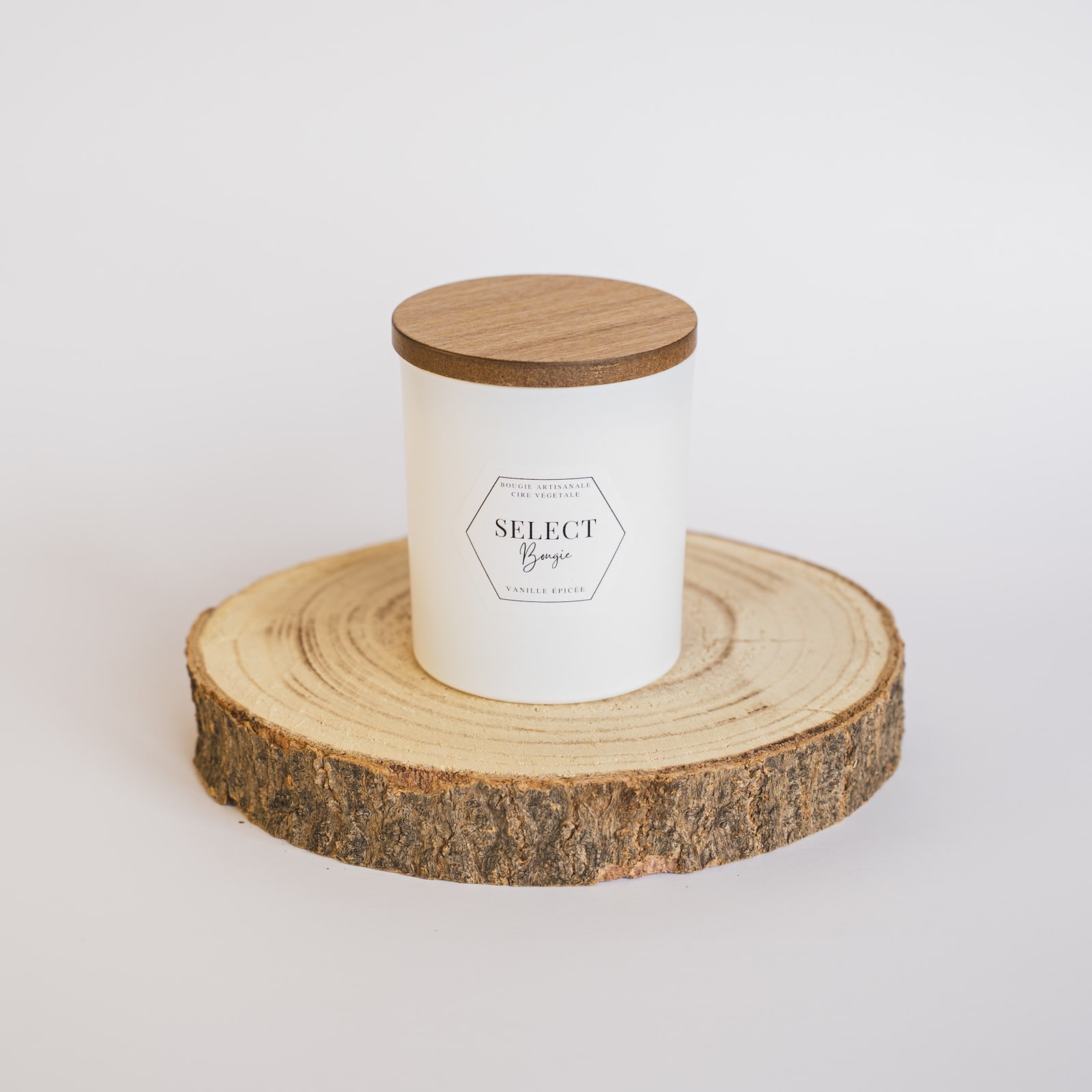 Bougie composée de cire végétale (colza et coco), d'une mèche en coton, d'un couvercle en bois et d'un contenant en verre blanc mat.