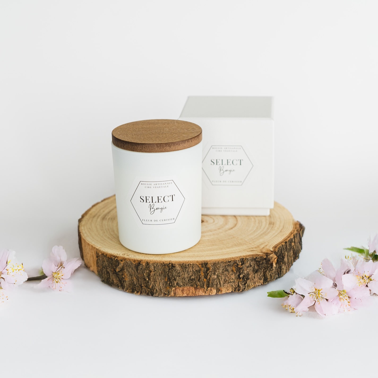 Bougie composée de cire végétale (colza et coco), de parfum de Grasse, d'une mèche en coton, d'un couvercle en bois et d'un contenant en verre blanc mat.