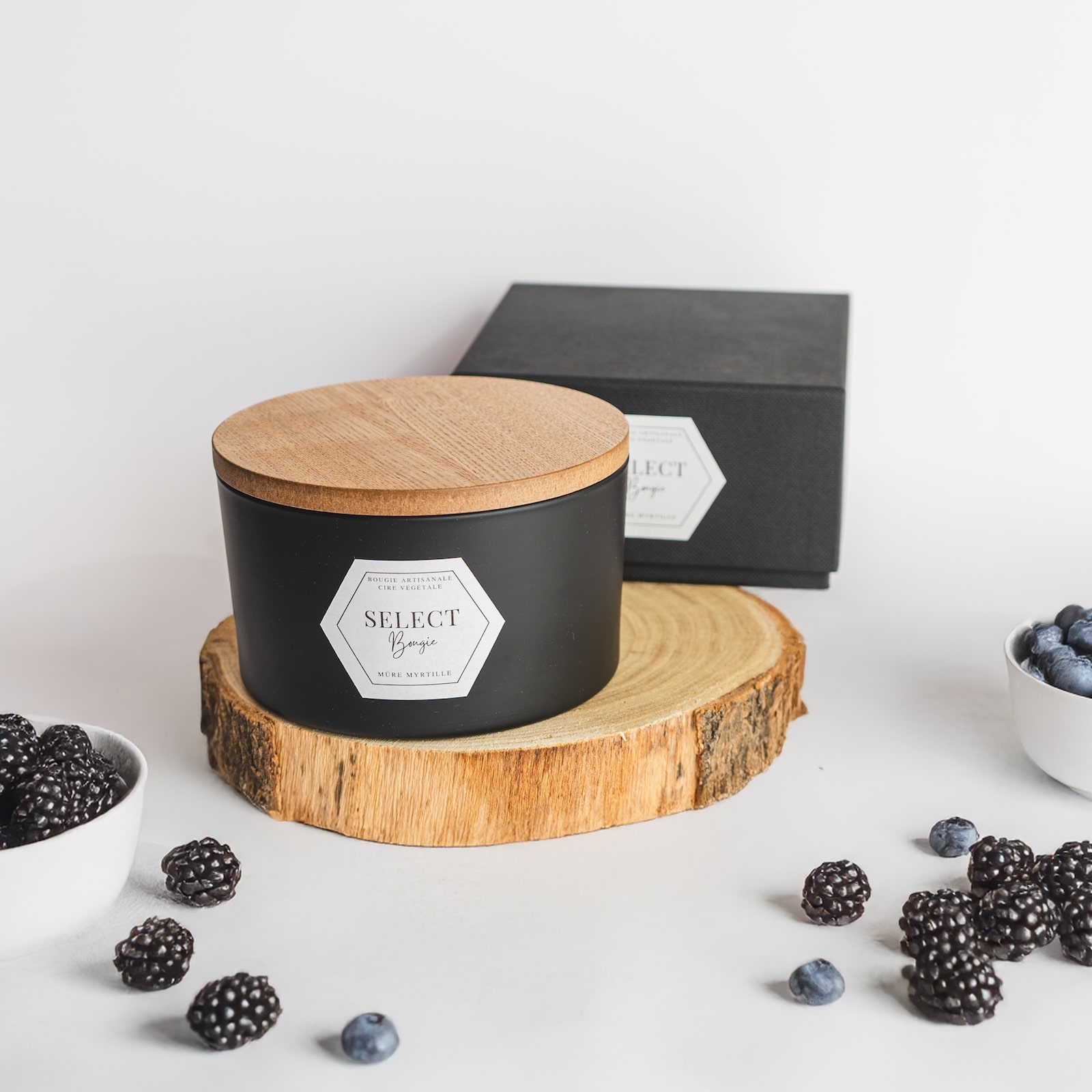 Bougie composée de cire végétale (colza et coco), de parfum de Grasse, de 3 mèches en coton, d'un couvercle en bois et d'un contenant en verre noir mat.