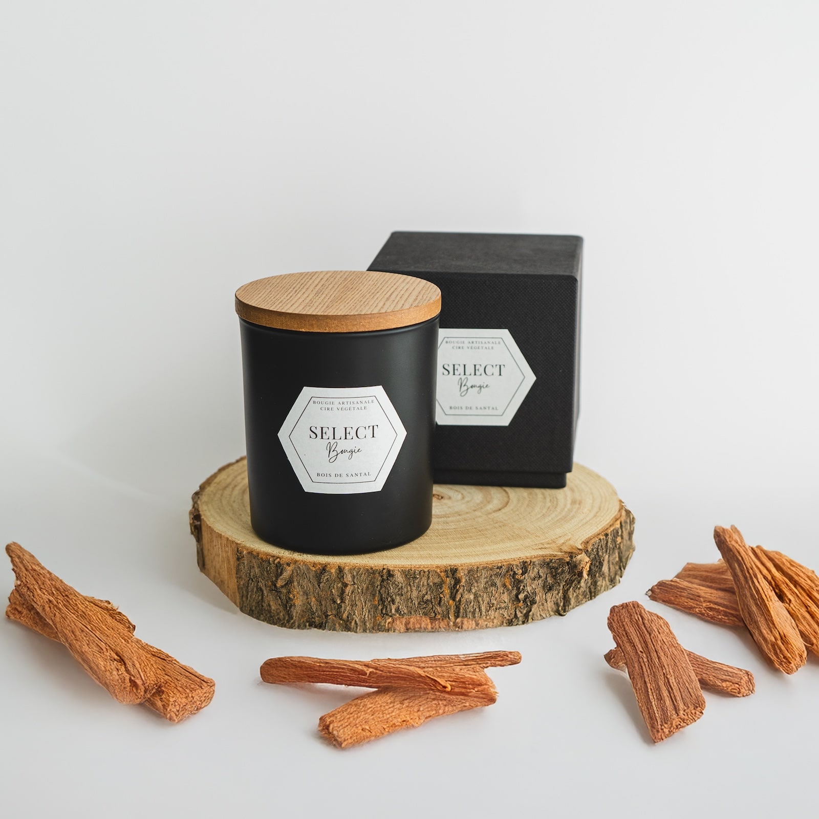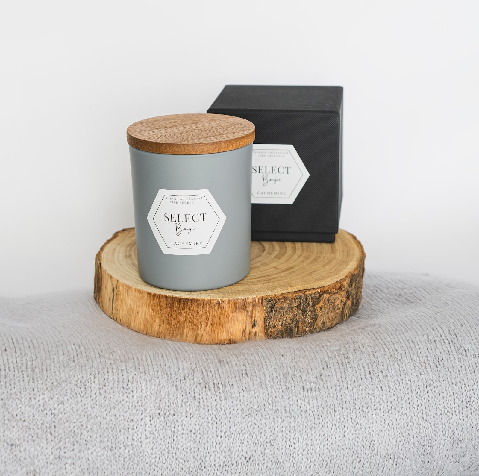 Bougie composée de cire végétale (colza et coco), de parfum de Grasse, d'une mèche en coton, d'un couvercle en bois et d'un contenant en verre noir mat.